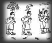 The earliest Aztecs—or Mexica—did not keep written records, passing on their traditions by word of mouth from one generation to the next until the 16th century when Spanish friars wrote down much of their history. In addition, the story of their migration from the legendary northern homeland of Aztlán (‘place of the heron’) under the guidance of the god Huitzilopochti (above right) appears in several post-conquest works that use the traditional Toltec writing that is both pictographic and ideographic. For instance the Boturini codex (below): here Huitzilopochtli is shown wrapped in a medicine bundle, and carried on the back of one of the priests. (The image depicts, with ‘speech glyphs’, the god giving directions; the ‘footprints’ in the codex, often believed to indicate direction, have also been interpreted as an indication of the god’s invisible presence.) |